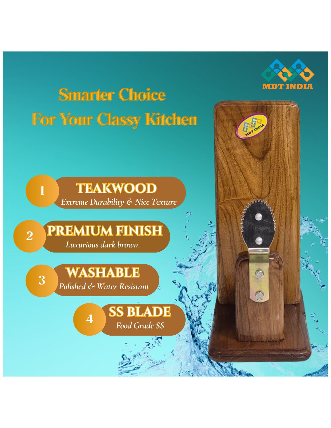 Experience the perfect blend of tradition and convenience with the MDT INDIA Polished Teakwood Tabletop Coconut Scraper, thoughtfully designed to meet the demands of modern kitchens while preserving the essence of traditional cooking. This scraper is a reliable kitchen companion for anyone who regularly prepares dishes using fresh coconut — a key ingredient in many Indian and South Asian recipes. Crafted from premium quality polished teakwood, the base of the scraper is not only strong and durable but also aesthetically pleasing. The elegant polished finish adds a touch of sophistication to your kitchen, while its smooth texture ensures that it won’t leave any scratches on your countertops or dining tables. Thanks to teakwood’s natural strength and light weight, the scraper remains sturdy in use and easy to carry or move when needed. The real star of the product is its stainless steel blade, engineered for efficient and uniform coconut shredding. Unlike traditional blades that rust over time, this one is rust-resistant, easy to maintain, and highly hygienic. Cleaning the blade is effortless—just rinse under tap water, and it's ready for the next use. Designed for tabletop placement, this scraper can be locked in place with your body weight while operating, making it both stable and user-friendly. It eliminates the need for clamping or installation, offering the freedom to use it anywhere – whether in the kitchen, on a countertop, or even outdoors. With a compact size of 31 x 12 x 20 cm and a lightweight design (1.2 kg), it takes up minimal space and fits easily in kitchen cabinets or shelves when not in use. The MDT INDIA Tabletop Coconut Scraper is the perfect choice for those who value both functionality and design. It's a practical, portable, and elegant solution for effortlessly scraping fresh coconut, making it a must-have tool in every home.