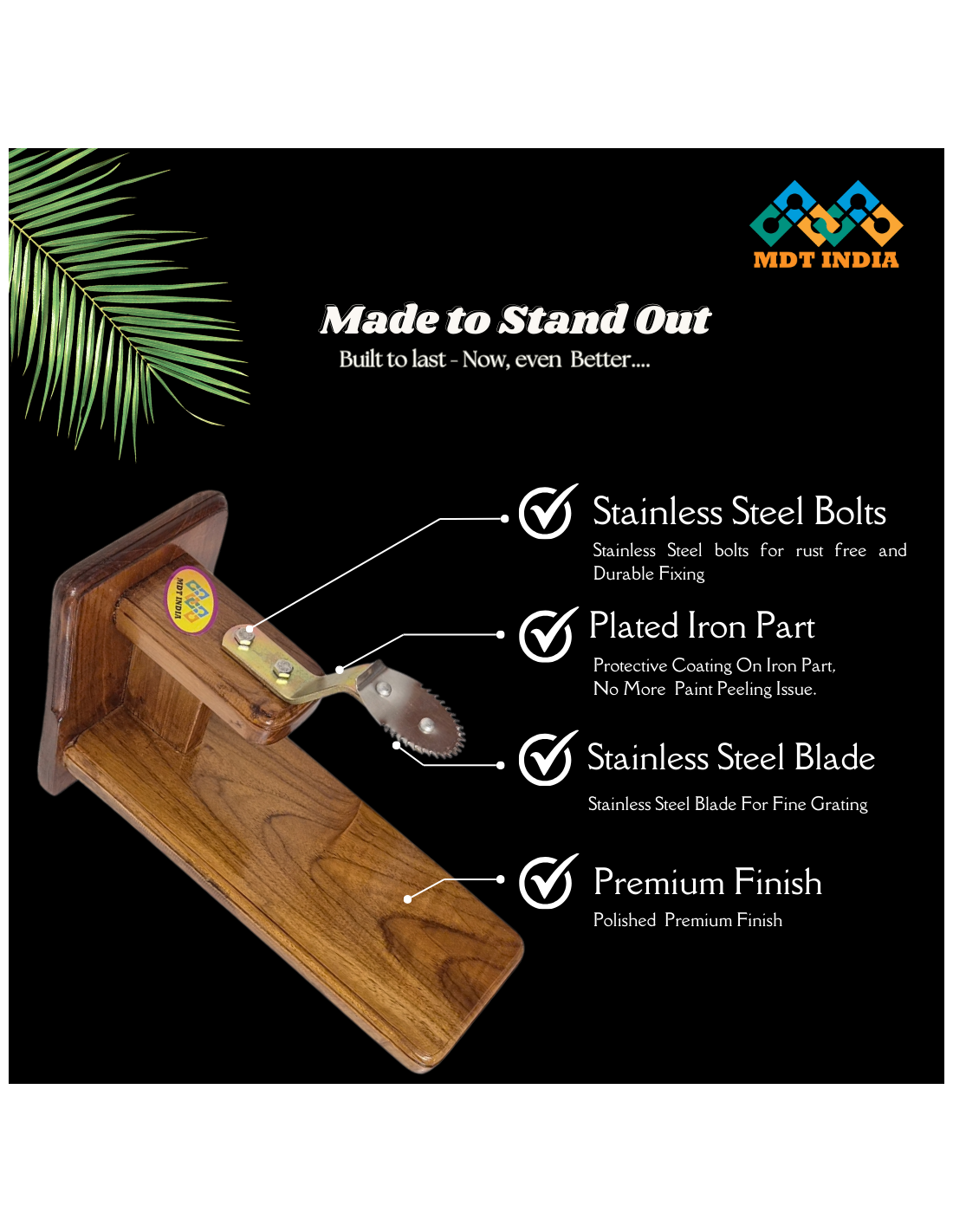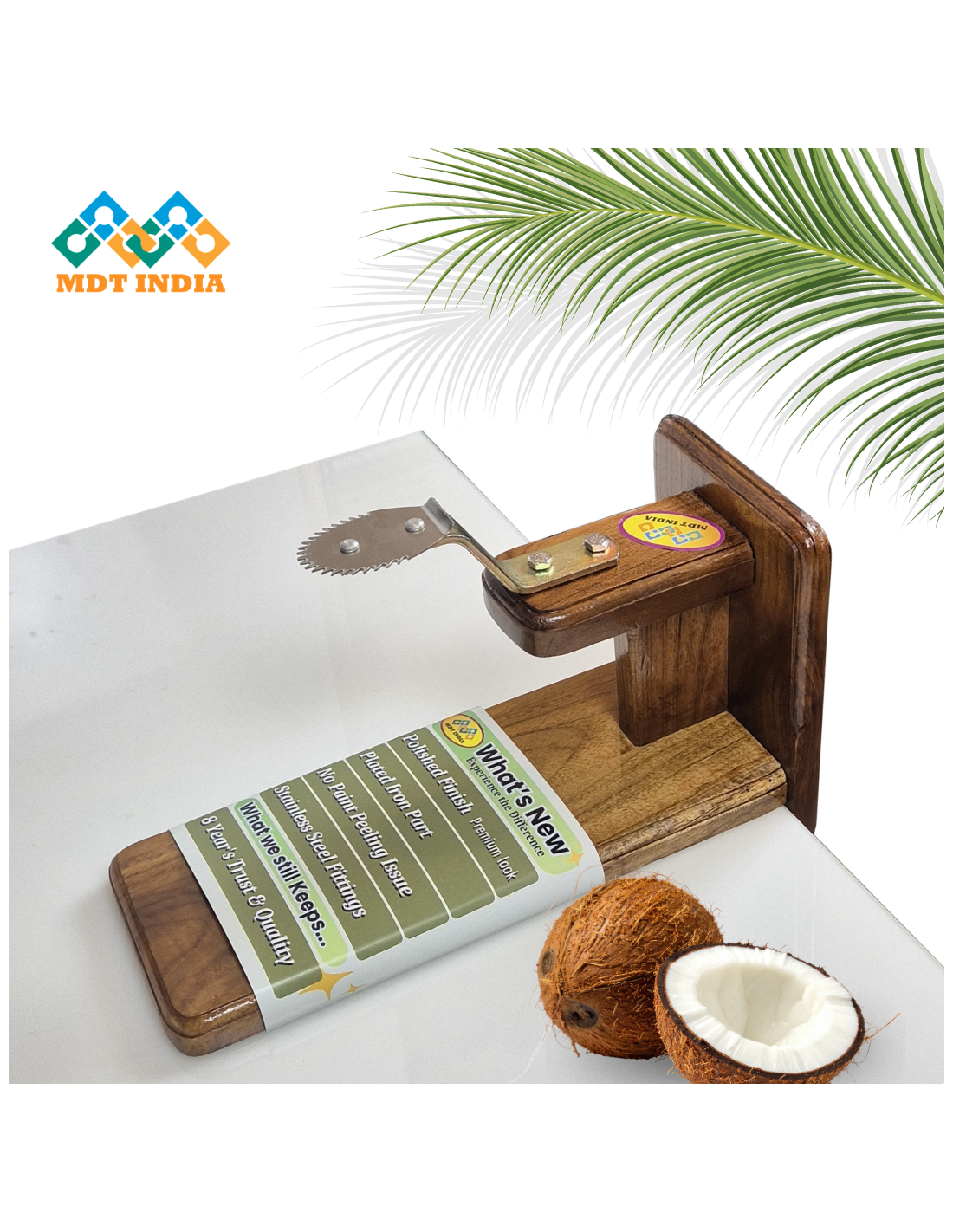 How to use: Position the scraper on any flat surface at a comfortable and convenient height. Stand close to its flat side and begin scraping the coconut firmly.