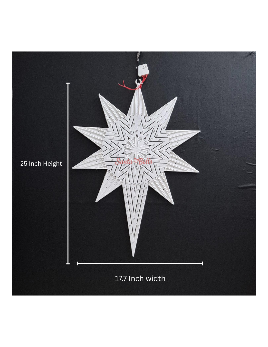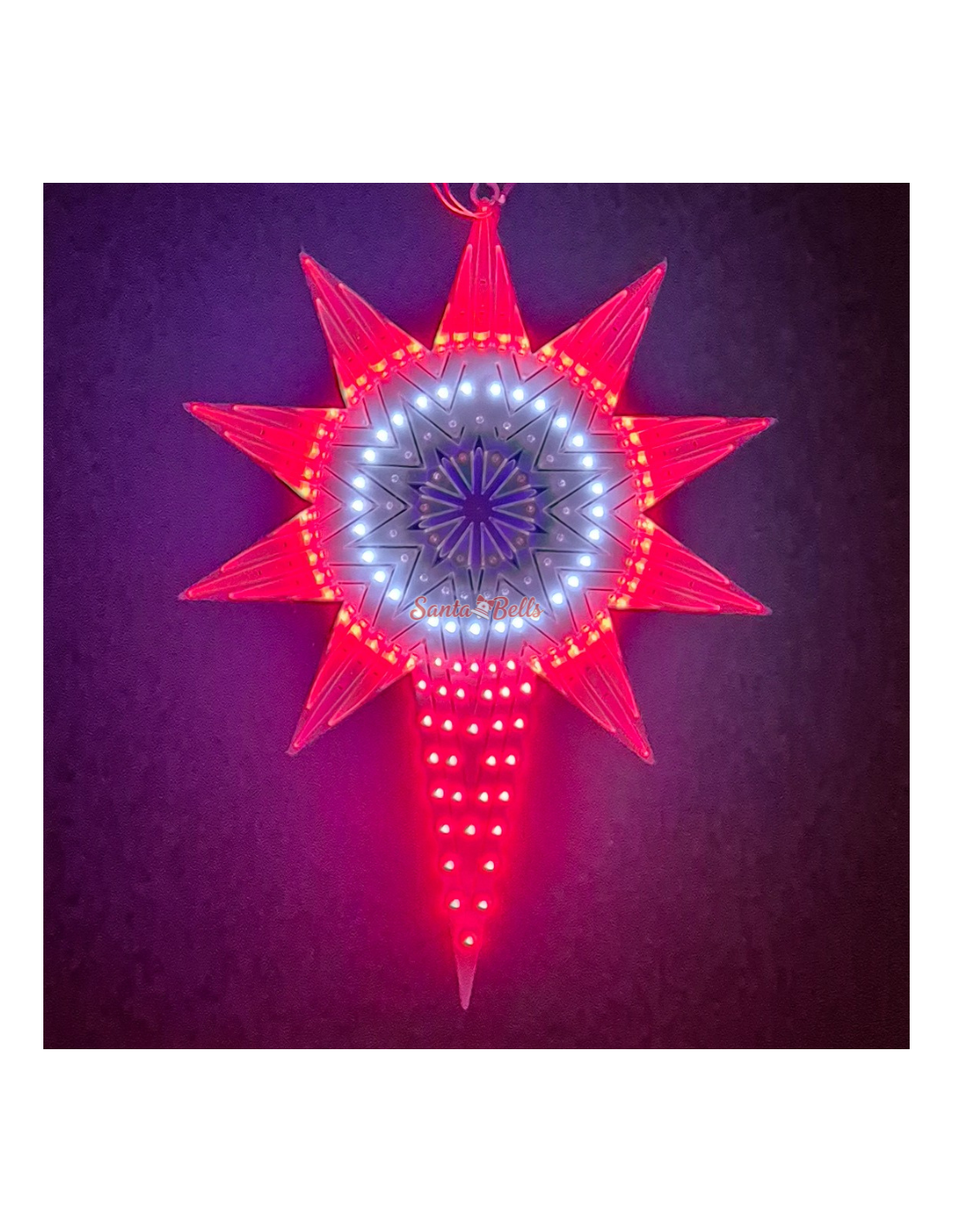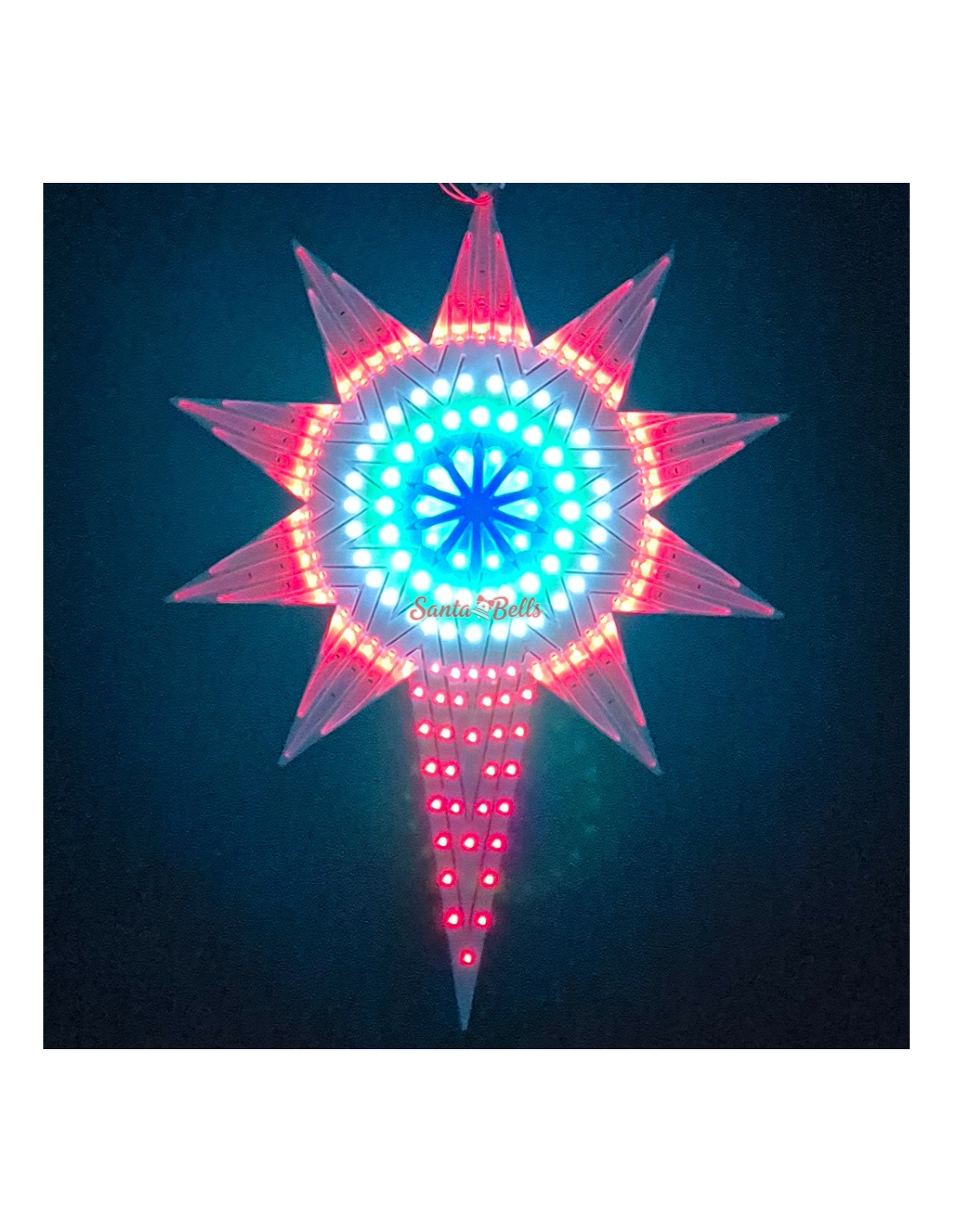 SANTABELLS Xmas Star Foringcen comes with LEDs Count red - 77, white - 31, green - 21, blue- 10 , Power input 220V.